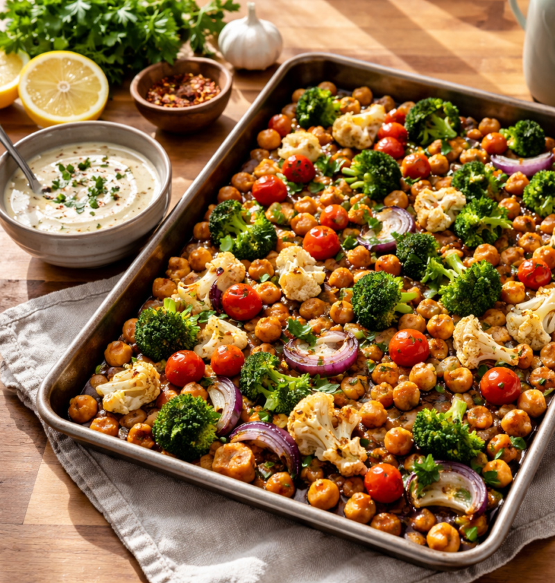 Na pekač gre grobo narezana cvetača, brokoli, rdeča paprika, čebula in bučka, dodana naj bo kuhana čičerika iz kozarca, dobro odcejena. Vse se premaže z oljčnim oljem, dimljeno papriko, mletim kumino, česnom v prahu in limonino lupinico. Peče se pri približno 220 stopinjah toliko časa, da se robovi obarvajo in čičerika dobi rahlo hrustljavost. Omaka se naredi iz grškega jogurta, tahinija, limoninega soka, soli in drobno sesekljanega peteršilja. Ta kombinacija je tipičen primer pametne sestave. Pekač je osnova za dve uporabi, prvi dan kot samostojen krožnik, naslednji dan pa kot polnilo za polnozrnato tortiljo ali skledo z rjavim rižem.