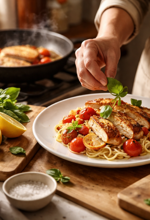Hiter obrok pogosto postane težek, ker se poseže po smetani. Zgoščen jogurt ali skyr da omaki beljakovinsko hrbtenico, vendar zahteva pravilno temperaturo. Če se jogurt doda na vrele testenine na visoki temperaturi, se beljakovine sesirijo. Rešitev je, da se ponev odmakne z ognja, doda se zajemalka škrobne vode od testenin in šele nato jogurt. Česen se lahko na hitro pogreje v olju, vendar ne do rjave, ker hitro postane grenak. Na koncu pridejo zelišča, limonina lupinica in poper, kar ustvari svež, sodoben profil, ki ustreza tudi poleti.