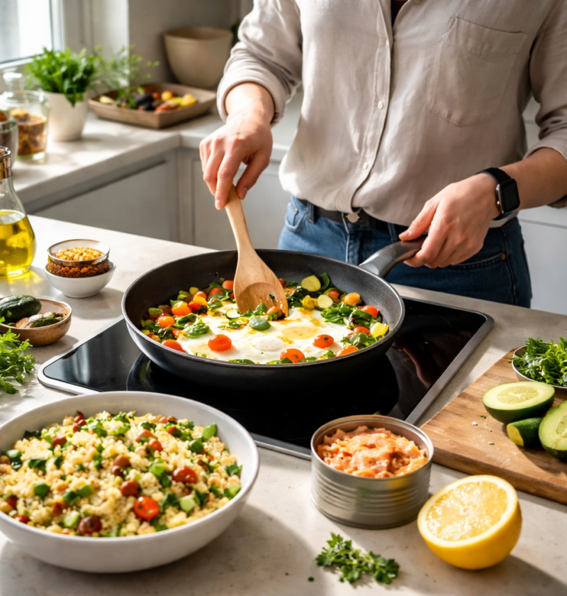 Največjo razliko naredi nekaj preprostih, a discipliniranih navad. Če so v hladilniku vedno jajca, ena posoda kuhane žitarice, ena posoda oprane zelenjave in vsaj ena hitra beljakovina, kot je skuta ali riba iz konzerve, se obrok sestavi v desetih minutah. V praksi se pogosto vidi, da ljudje kupijo sestavine za en recept, nato pa ostanki obstanejo. Bolj smiselno je kupovati modularno. Ena kuhana osnova lahko tri dni menja vlogo, enkrat je priloga, drugič solatna baza, tretjič del ponve.