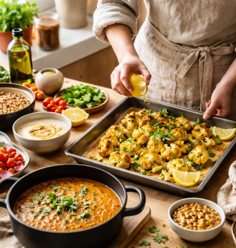 Drugi pogost primer je družina, kjer nekdo pričakuje znano udobje, drugi pa želi nekaj lažjega. Tukaj zmagujejo pečene jedi na visoki temperaturi. Cvetača, narezana na večje kose, se obloži z oljem, dimljeno papriko in soljo ter speče do rjavega roba. Ko se ji doda omaka iz tahina, limone in česna ter zraven še solata iz čičerike, dobi krožnik nosilnost in sitost. V praksi se pokaže, da prav ta rjava skorjica prepriča tudi skeptike, saj doda okus, ki ga ni mogoče dobiti s kuhanjem v vodi.
