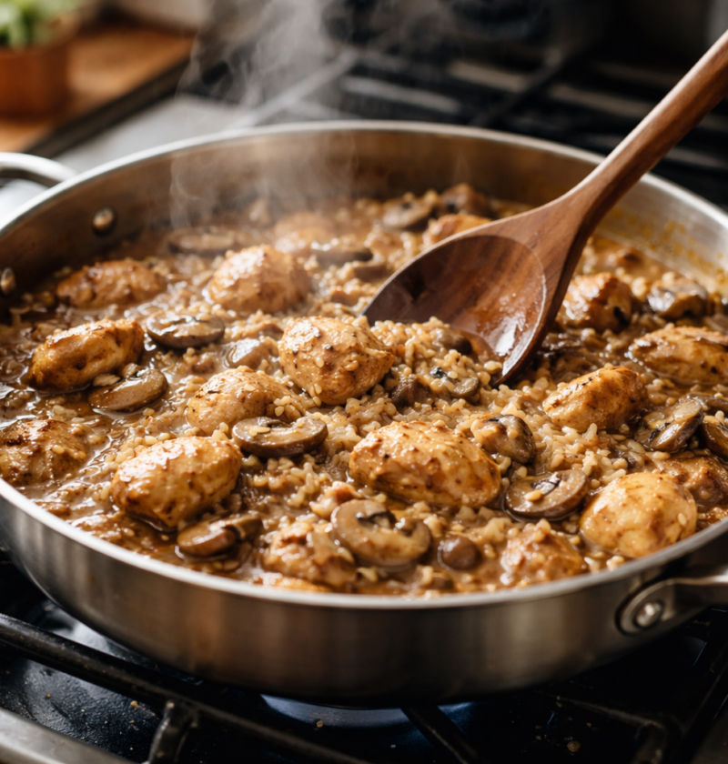 Za hitro domačo klasiko se izkaže ponev s piščancem, gobami in rižem. Piščanca se zapeče, umakne, v isti ponvi se zmehča čebula, doda gobe, nato česen, odglazira z malo belega vina, vsuje riž in zalije z vročo jušno osnovo. Pokrov in mirno kuhanje na srednji temperaturi naredi svoje, na koncu se vrne piščanec, doda se pest graha ali špinače in košček masla za sijaj. Okus je poln, ker se nič ne izgubi po poti.