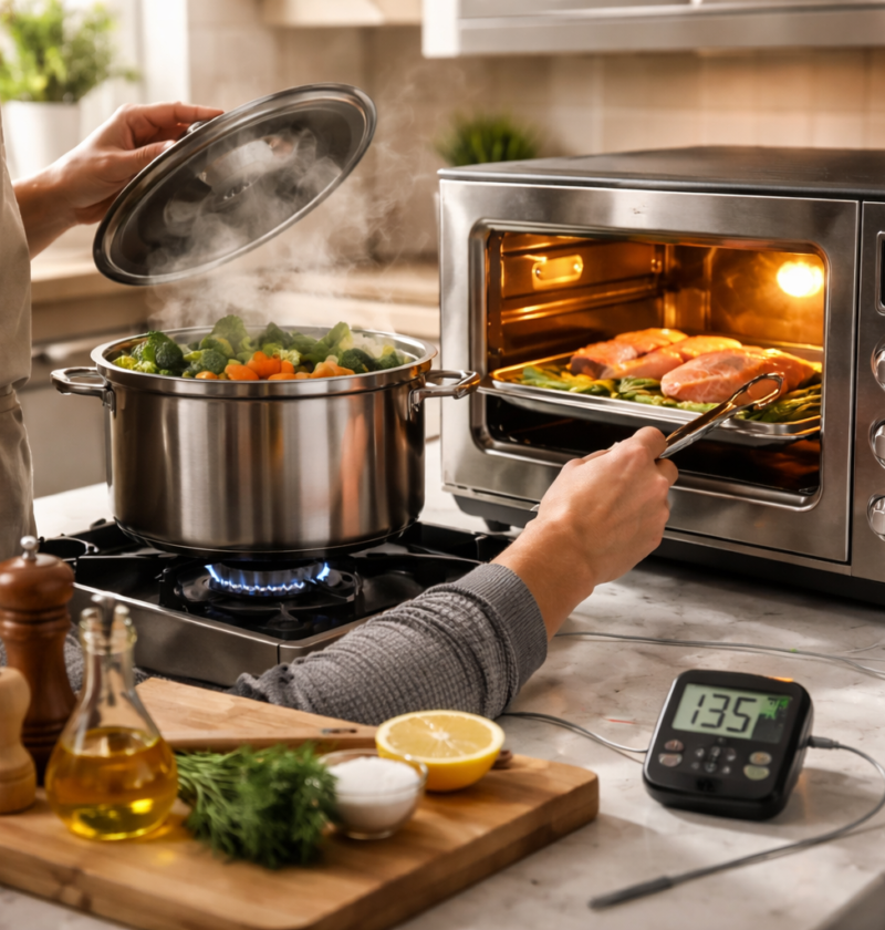 Para ostaja eden najboljših načinov, ker ohranja teksturo in barvo ter ne potrebuje dodanih maščob. Vendar para ni enaka pari. Klasično kuhanje na sopari je odlično za zelenjavo, a pri ribah in piščancu lahko deluje medlo, če se ne zgradi okusa. Praktična rešitev je kratko pečenje v pečici ali na ponvi pred ali po sopari, samo toliko, da nastane površinska aroma, nato pa se nadaljuje nežno. Tako nastane občutek pečenja brez litrov olja.